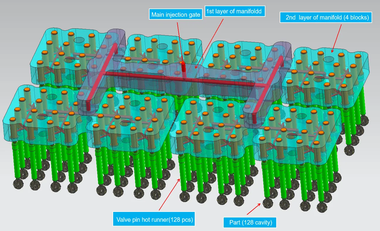 2. The second layer consists of four manifold systems, each independently fed by a branch runner from the main nozzle. The runners within the manifold are divided into three layers, finally entering the hot tip from the sub-runners before filling the product. Here, each runner is balanced to ensure simultaneous filling for all 128 cavities, completing injection at the same time. This guarantees product quality, significantly improves yield, and greatly enhances product qualification rates.