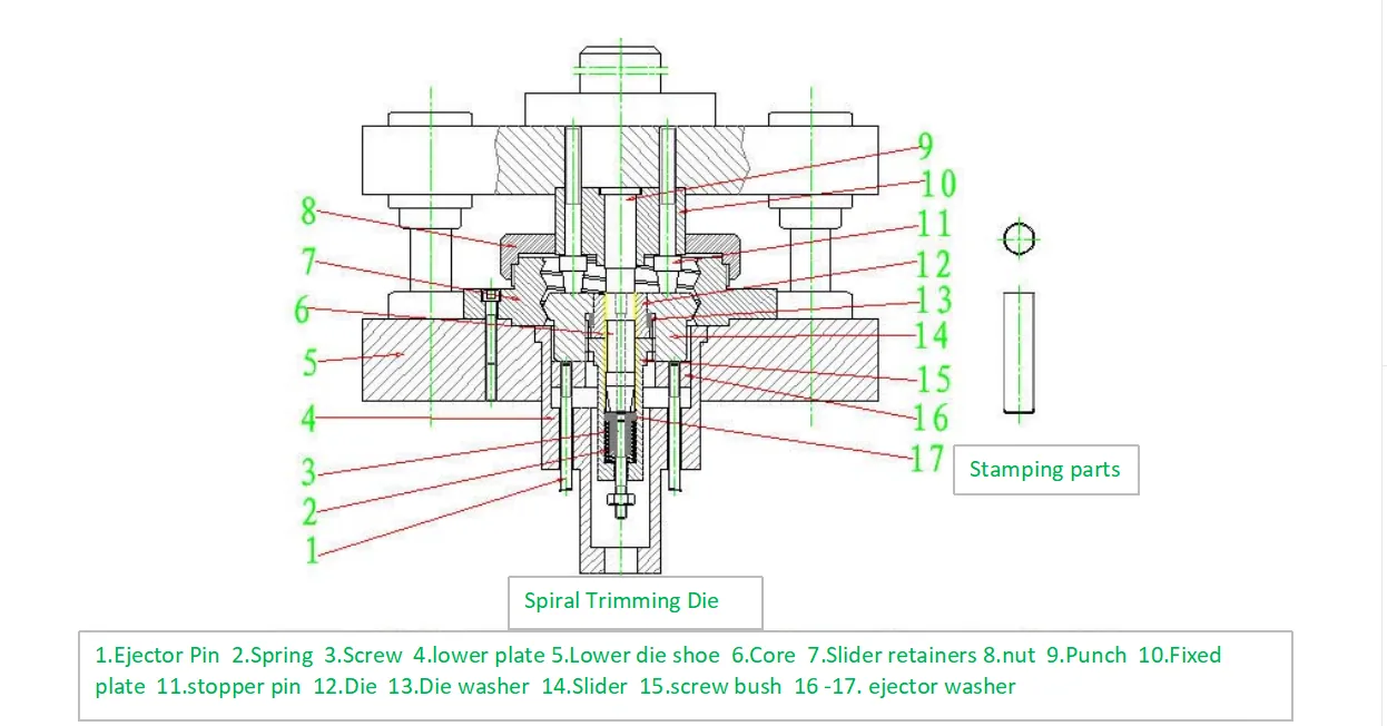 (3)Die 12 also moves accordingly, performing a relative motion against the punch to trim the workpiece. When the press slide ascends, the ejector ring 16, under the action of the ejector mechanism, pushes the slide block 14 back to its original position along the spiral direction. The spring 2 and the ejector ring 17 eject the workpiece and the core.